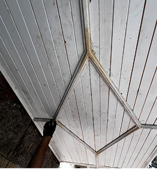 Le p/afond ornemental est revele en contre-plongee, mettant en vedette le losange central soigneusement assemble. Chaque latte de bois s’embofte avec rigueur, formant un decor geometrique typique des habitations de prestige d’autrefois. Les lignes convergent en douceur vers le centre, evoquant /’art de la menuiserie traditionnelle. Les joints frafchement poses
