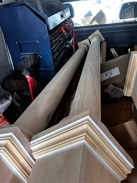 pièces fabriquées entièrement en atelier: colonnes, moulures, sections courbées et assemblages décoratifs. Avant d’être posés