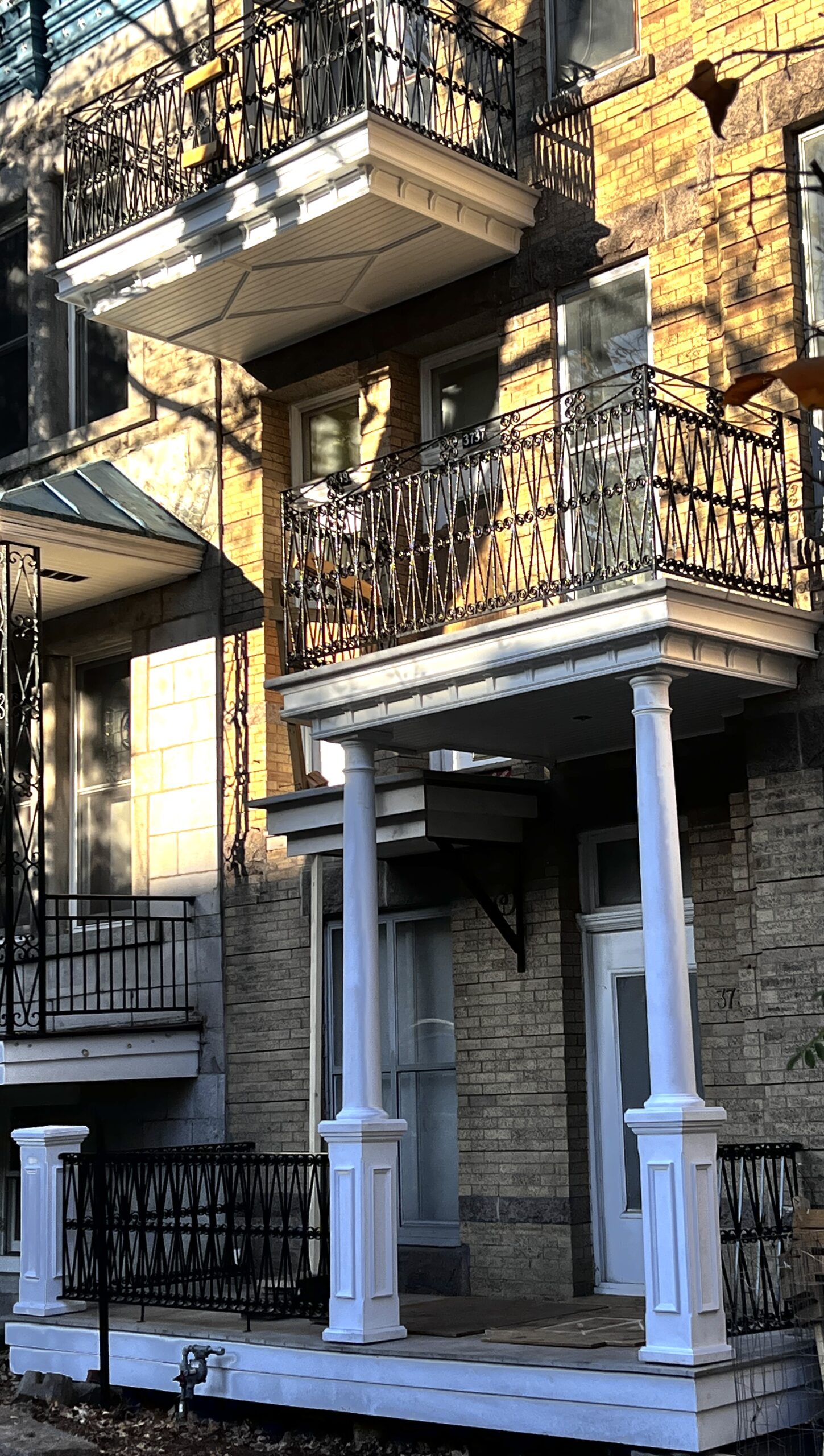 L’installation du losange central, d’une précision mathématique, a été réalisée avec un soin extréme pour aligner chaque élément, en harmonie avec les lignes patrimoniales du batiment. Les colonnes, travaillées entiérement de facon artisanale, témoignent de notre expertise et de notre respect des exigences de la Ville de Montréal. En suivant les références historiques et les plans, nous avons recréé un ouvrage qui non seulement honore le patrimoine, mais s’inscrit aussi dans une tradition artistique vivante. de chaque coupe, /a finition minutieuse, et l‘intégration des colonnes a la facgade, sont autant d’éléments qui soulignent le